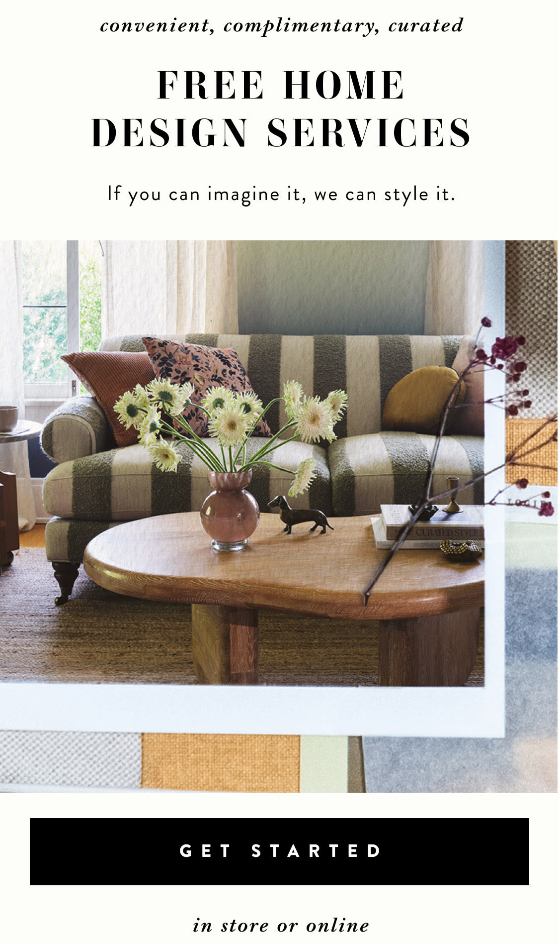 Yes, of course! Click here to find a Home Design Studio near you or to book a free virtual appointment with one of our home stylists for expert advice, swatches and more.Most Anthropologie stores also have a selection of furniture on display. If you are looking for a particular item, we recommend calling to see if your local store has any available to view.