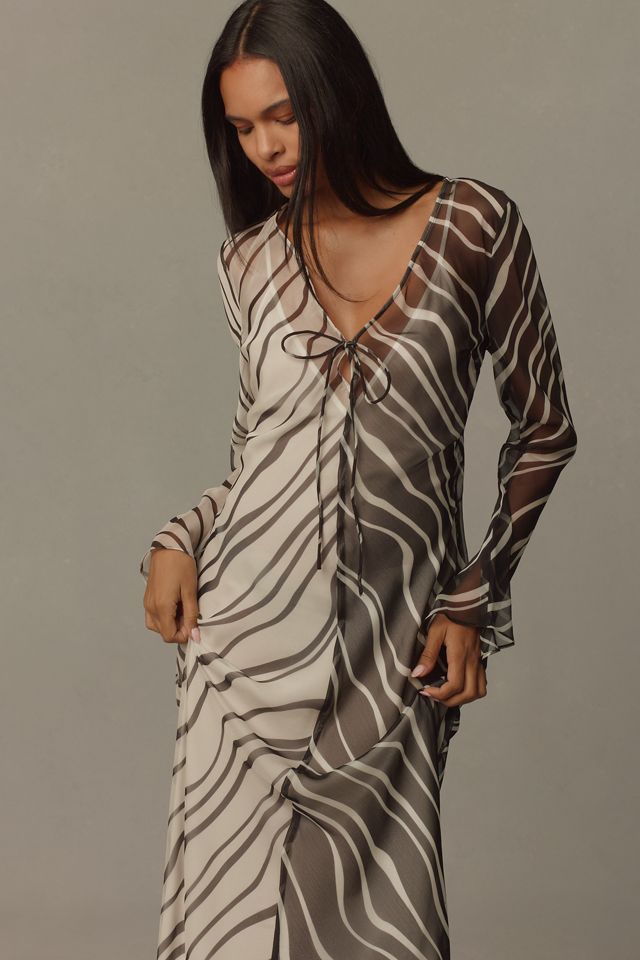 Take a walk on the stylish side with the season's wildest prints. The Significant Other Salma midi dress features a sheer overlay with long sleeves and a tie-neck detail.