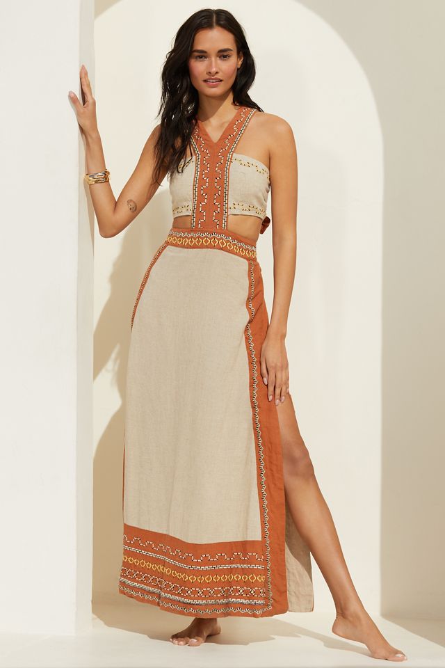 Indulge in the fruits of Celandine with this dress, crafted from a linen blend with intricate embroidery, a paneled halter neckline, and breezy side slits.