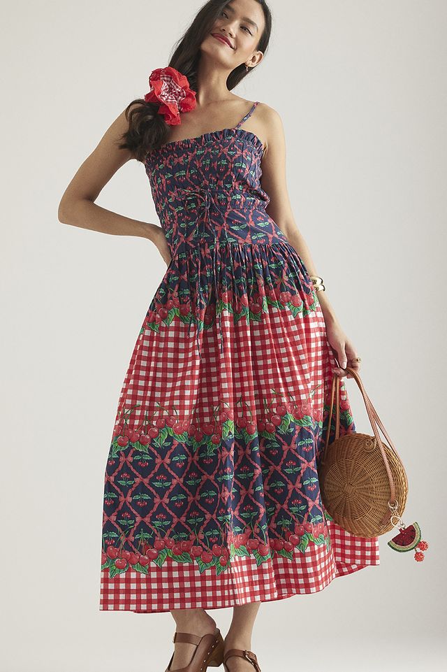 Adorned with checks and cherries, this quirky sleeveless midi dress by Damson Madder makes summer styling extra sweet.