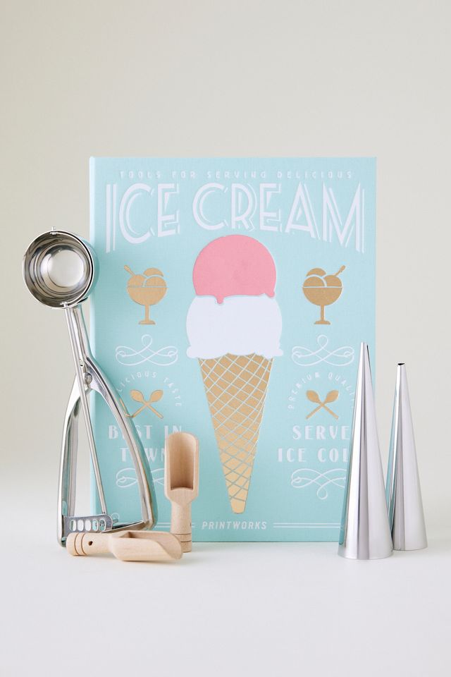Servez la glace avec style lors de rassemblements d'été grâce aux outils essentiels de PRINTWORKS, comprenant une cuillère en acier inoxydable et deux formes de cônes, ainsi que deux cuillères en bois pour vermicelles. Présenté dans une magnifique boîte en forme de livre, c'est le plaisir ultime pour les amateurs de glace ou pour l'exposition sur votre étagère de cuisine.