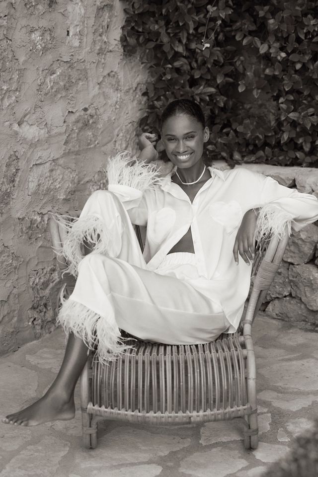 The Hutch Faux-Feather Trim Heart-Pocket Pajama Set offers a playful and luxurious touch, featuring luxe fabric with chic faux-feather trim and charming heart-shaped pockets.