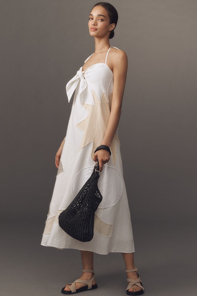 Inspired by the wall hangings and handmade ceramics of a traditional Chora house in Patmos, this Lingua Franca midi dress features hand-applied patchwork designs, front tie, and an elasticized back for comfort—wear it with or without the straps.