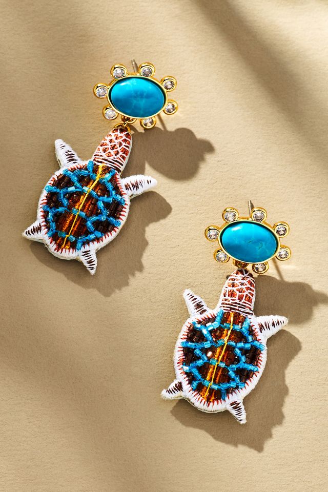 - 14k gold-plated brass, semi-precious turquoise stone, cubic zirconia, silk fabric, silk threads, polyester threads, glass beads, glass stones, plastic sequins, leather backing, stainless steel post