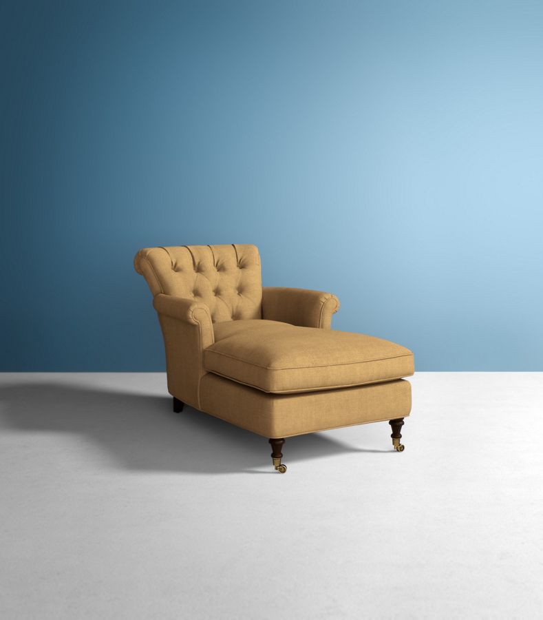 This tufted seat is modeled after an English classic our buyers happened upon at an antiques market. With its handcrafted wood frame, castered front legs and generous cushion, it's a delight to sink into.
