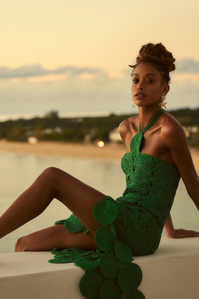 SIMONMILLER's iconic Beep Beep Dress is a hand-knit lurex crochet halter maxi silhouette with circular cutout details