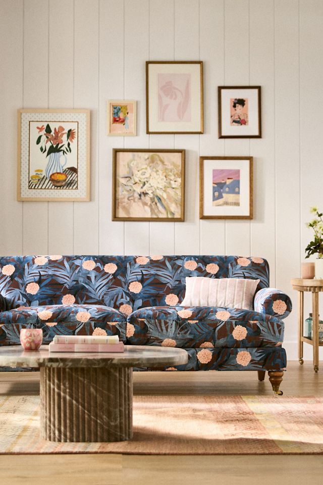 This velvet two-cushion sofa features classic lines with hints of modern design, along with scrolled, elegant arms and a deep, plush seat.
