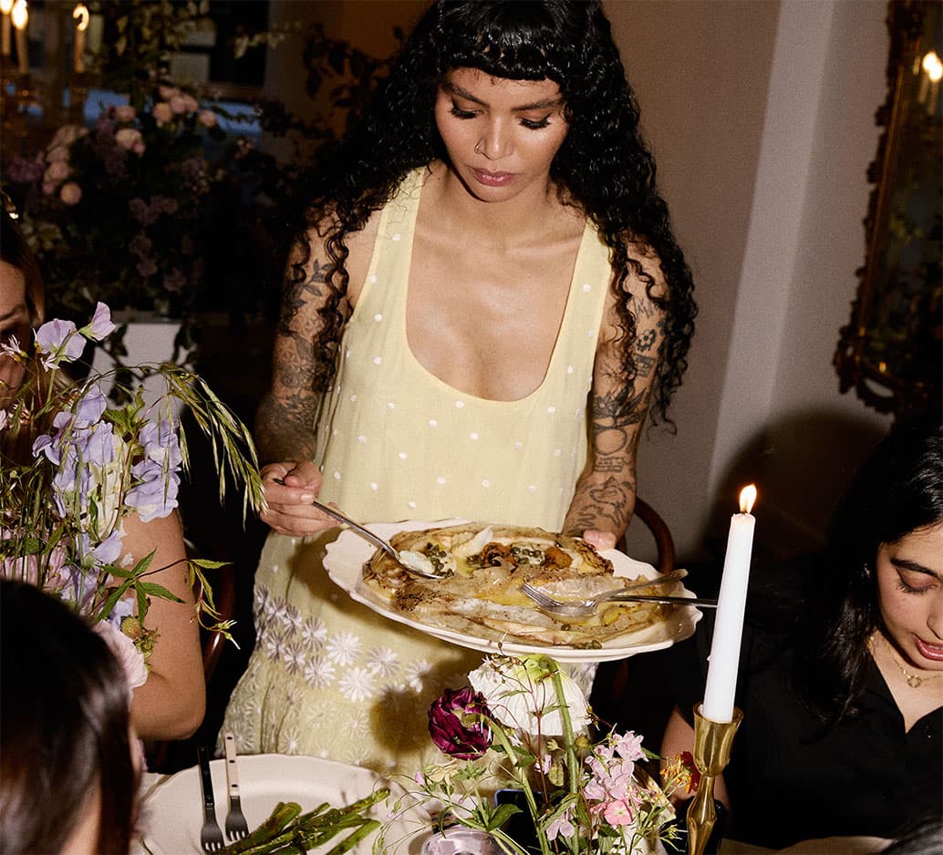 For Sophia, the season is what guides and inspires. The dinnerware collections, with their bright colors and playful script, felt perfectly in step with the shift in seasons, the end of spring, the air of summer, and its warmth and bounty making its way to us. “These collections are fun and summery and bright, that’s so in tandem with what’s going on right now with food. We’ve got lots of green beans. But we’ve also got great berries. Summer is very ice cream sundae / popsicle / fresh, light vinaigrette salad vibes, you know?” Cue the courses: Niçoise Salad, Cod en Papillote, Seared Caraflex Cabbage, and a Build-Your-Own Ice Cream Sundae bar, to name a few. (The homemade toasted coconut ice cream, finished with a drizzle of raspberry coulis, was a favorite.) Pinks and pale butter yellows were plentiful, in the food, the florals, even the fashion.